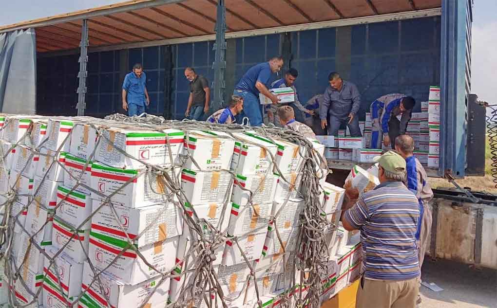The humanitarian cargo includes food, relief materials, blankets, tents, electric lamps, and medical equipment and supplies destined for the citizens of the neighboring country, who sought refuge Syrian territory from the brutal bombardment by the Israeli army.