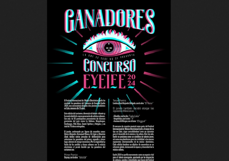 La Habana, 16 oct.- La obra Yaloldé, del artista Boynay, se alzó con el Primer Premio en el Concurso de Creación Eyeife 2024, convocado por Festival Internacional de Música Electrónica Eyeife, el mayor de su tipo en Cuba.