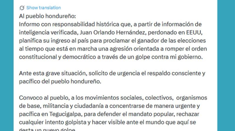 En un mensaje publicado en su cuenta de la red social X, Castro informó que, a partir de información de inteligencia verificada, el exgobernante Juan Orlando Hernández, perdonado por el presidente de Estados Unidos, Donald Trump, planifica su ingreso al país para proclamar al ganador de las elecciones.
