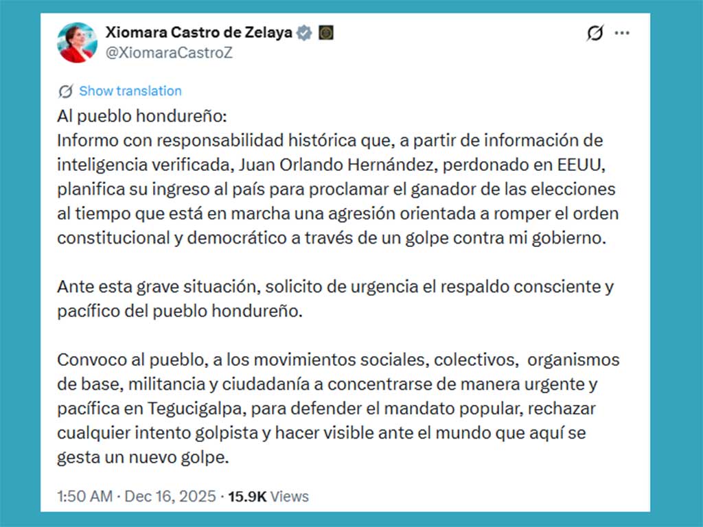 En un mensaje publicado en su cuenta de la red social X, Castro informó que, a partir de información de inteligencia verificada, el exgobernante Juan Orlando Hernández, perdonado por el presidente de Estados Unidos, Donald Trump, planifica su ingreso al país para proclamar al ganador de las elecciones.