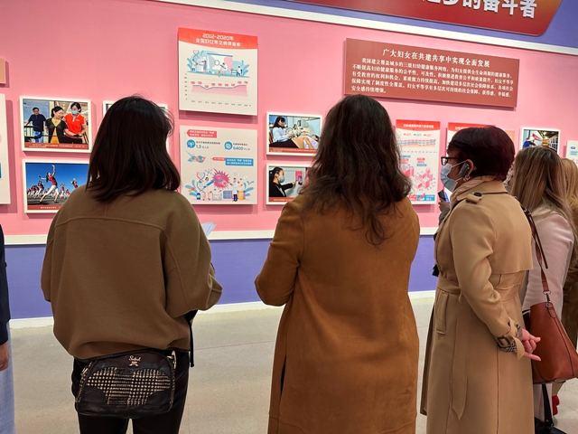 The center shows the Chinese women’s achievements in terms of increased life expectancy, decreased maternal mortality and better access to health care, social security, education and leadership position.